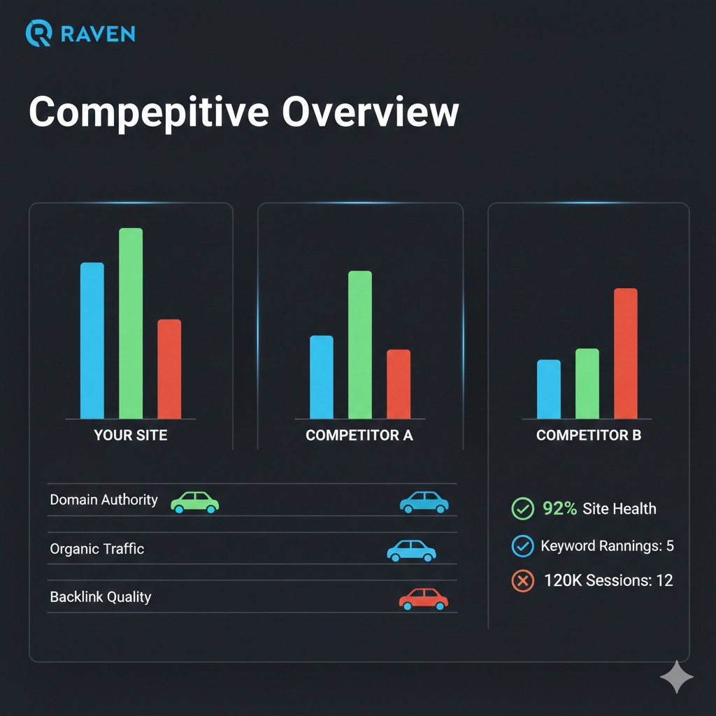 Raven Tools includes competitive analysis features that surface metrics like domain authority, backlinks, keyword rankings, and other domain‑level quality indicators. You can pull domain info that covers quality, backlinks, pages, neighborhood, and social metrics to understand how your site compares to others in your niche.