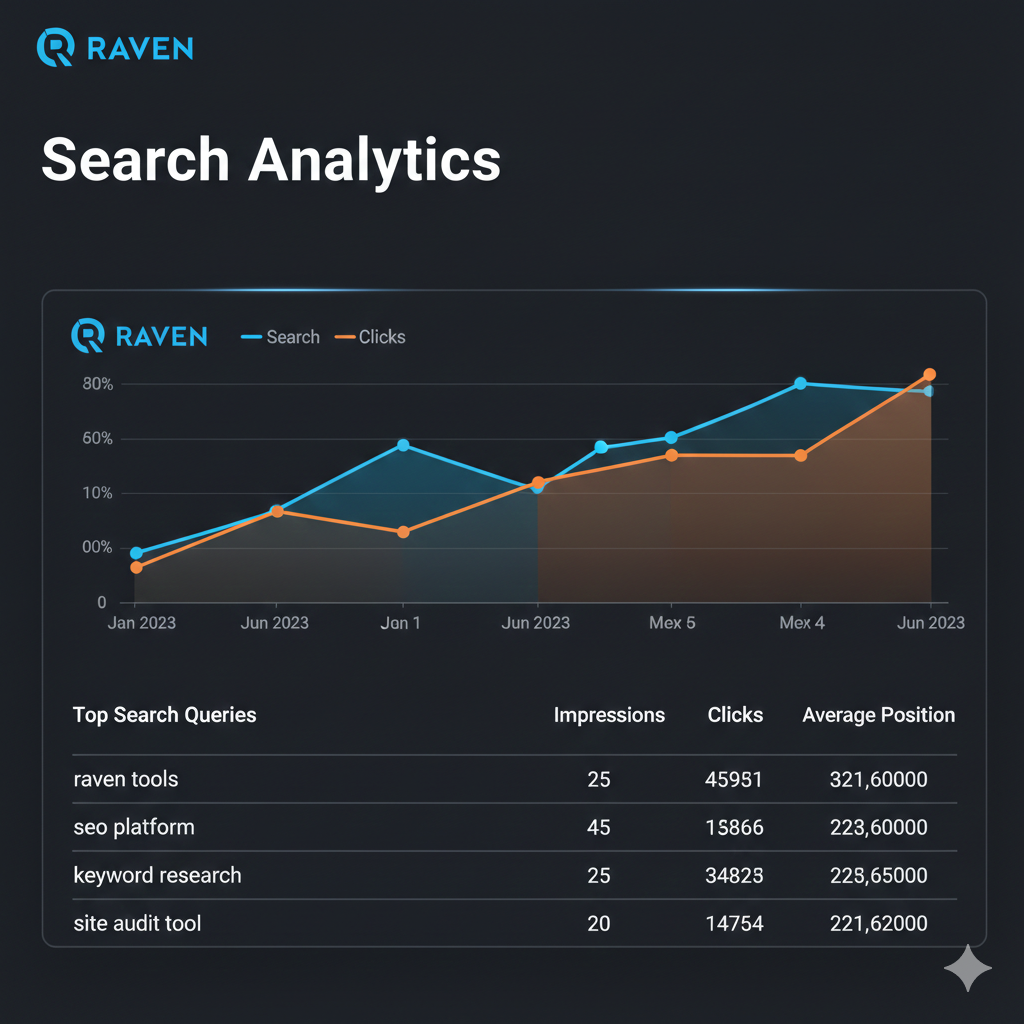 By integrating with Google Search Console, Raven Tools can display search queries, impressions, clicks, and average position directly inside your reporting environment. This lets you see which queries already bring traffic, which are underperforming, and where small optimization tweaks could drive big gains.