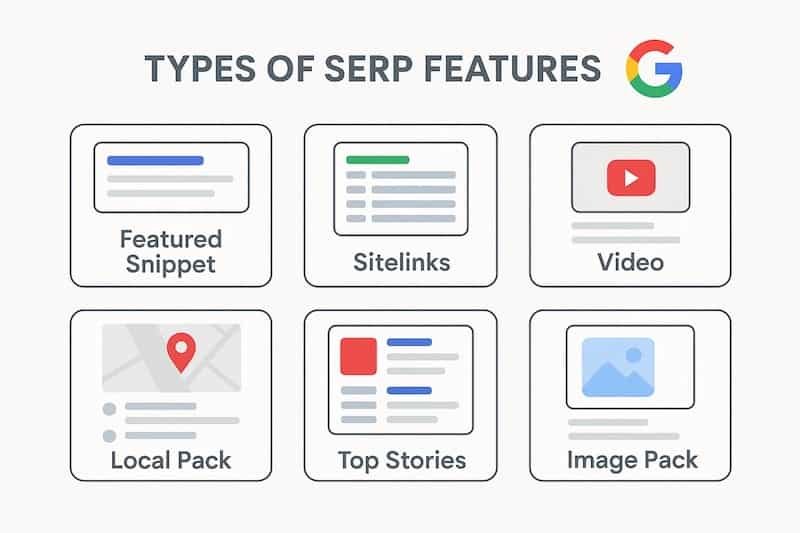 SERP features are any non-standard elements on a Google results page that go beyond the classic organic listing. They include things like Featured Snippets, People Also Ask, Local Packs, and AI Overviews.